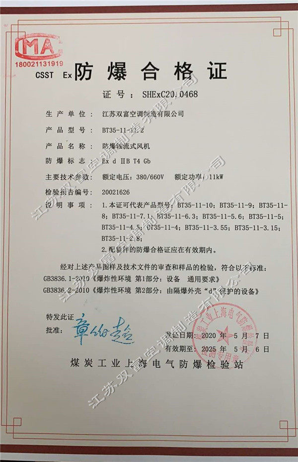 防爆風機盤管和防爆軸流風機的防爆合格證 江蘇雙富空調制造有限公司